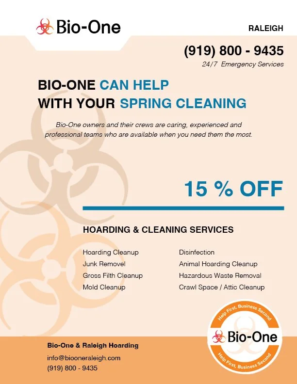 Creating marketing flyers for Bio-One Raleigh to increase awareness of hoarding services and promoting spring specials.